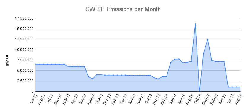 For a high-level overview of how StakeWise DAO’s SWISE emissions have evolved over the previous months, see the following chart: